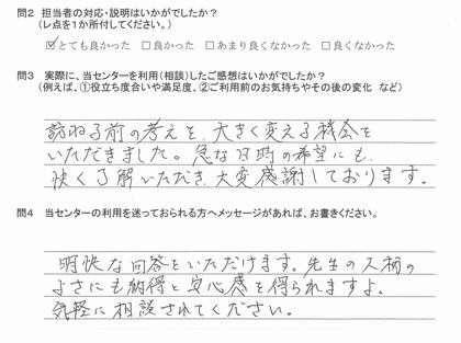 明快な回答をいただけます。先生の人柄のよさにも納得と安心感を得られますよ。